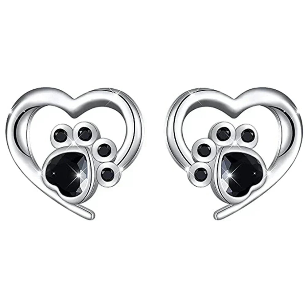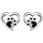 Náušnice ve tvaru srdce s paw print – Stříbrné náušnice s černým krystalem